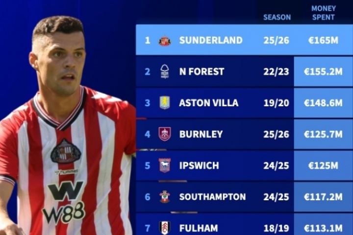 1.桑德兰 25-26 1.65亿欧