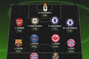 后卫:廷伯(阿森纳,7.46分)、T-克里斯滕森(乌迪内斯,7.18分)、查洛巴(切尔西,7.72分)、库库雷利亚(切尔西,7.39分)