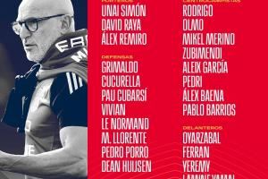 中场:罗德里(曼城)、奥尔莫(巴塞罗那)、梅里诺(阿森纳)、苏维门迪(阿森纳)、阿莱克斯-加西亚(勒沃库森)、佩德里(巴塞罗那)、阿莱克斯-巴埃纳(马德里竞技)、巴里奥斯(马德里竞技)